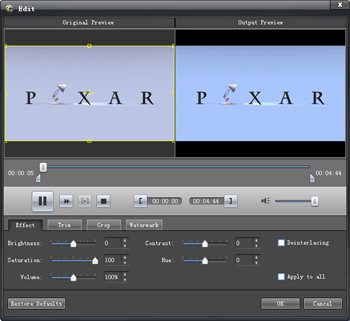 The video effect can be freely adjusted for better output. You can set video Brightness, Contrast, Saturation, Deinterlacing, etc. And these adjustments can be easily applied on all videos with the "Apply to All" button. - Convenient features