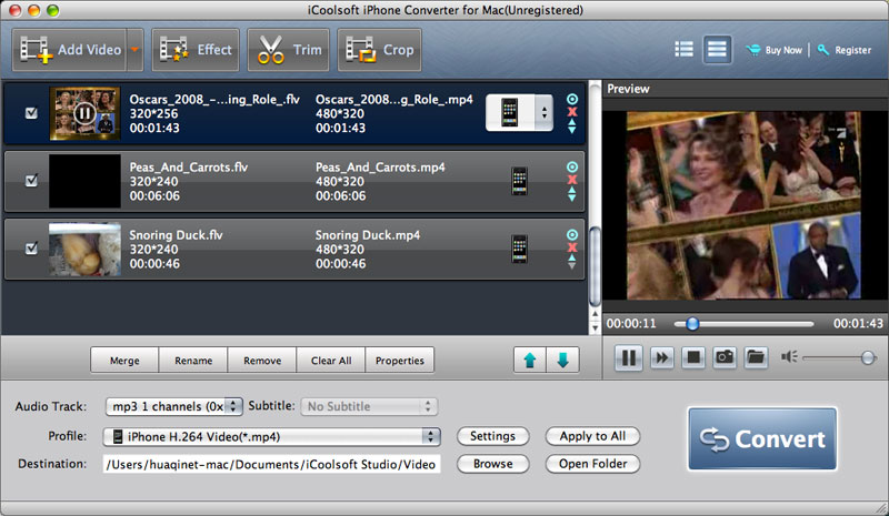 iCoolsoft iPhone Converter for Mac is a powerful and easy to use Mac iPhone video converter, which can convert MOV, AVI, MPEG, RMVB, WMV, ASF, MKV, FLV, 3GP and HD videos to iPhone MPEG-4, H.264 and MOV videos on Mac. This iPhone Converter for Mac can also convert audio file and extract audio from video to iPhone MP3, M4A, AAC files on Mac.