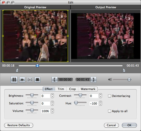 This iPhone converter for Mac also enables you to edit videos before converting to iPhone. You can specify any part of the video to convert, crop video to cut unwanted region, join multiple videos, adjust output effect, create text or picture watermark and so on.