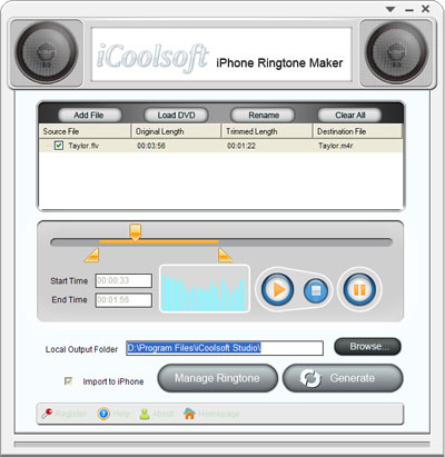 Besides converting almost all DVD, video, audio to iPhone ringtones, iCoolsoft iPhone Ringtone Maker also provides practical editing functions for you to cut the source file, specify any segment and convert to M4R ringtone file.