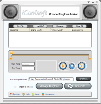 iCoolsoft iPhone Ringtone Maker is a professional tool to make ringtone for iPhone, iPhone 3G, iPhone 3GS and iPhone 4. This powerful iPhone Ringtone Maker can convert a wide range of video and audio formats to M4R ringtone files for iPhone. It can transfer the converted files to iPhone directly without iTunes. Even DVD are supported as the input.