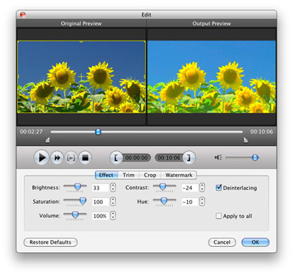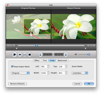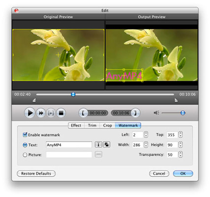 This versatile iCoolsoft MP4 Converter for Mac also helps you edit videos as you want. You can split the source videos into small parts to fit your player, merge multiple clips into one video for successive playback, adjust video Zoom Mode and crop screen area, adjust video effect to optimize the output, add text or image watermark to video, and so on.