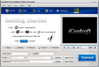Possessing many useful functions, this Sony Walkman Video Converter can help you to customize videos as you like. You can adjust effects, trim clips, crop displaying area, merge files, and add text/picture watermark with very easy operating steps.
