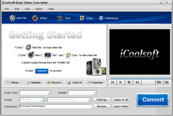 iCoolsoft Zune Video Converter also provides powerful video editing functions, like movie trimming, clips merging, effect adjustment, watermark creating, etc. for you to individualize Zune videos as you want.